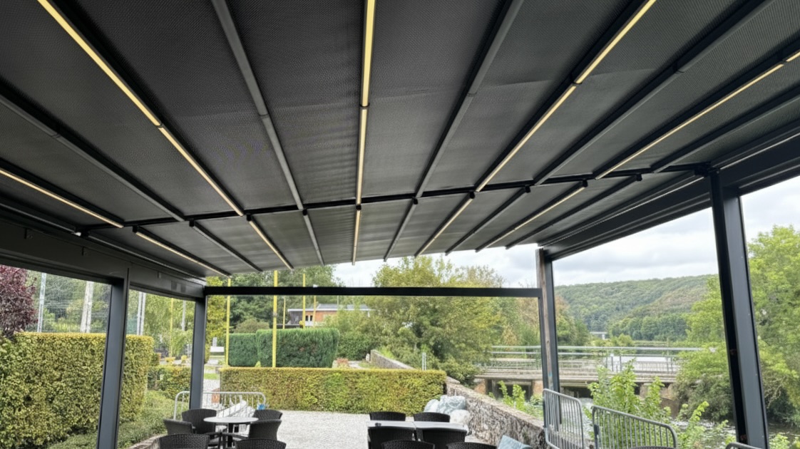 Belçika’nın Charleroi şehrinde, nehir kenarında konumlanan bu eşsiz kafe projesi için Canopee Classic Robust PVC pergola sistemimiz tercih edildi. Açık alanları yıl boyunca kullanıma uygun hale getirmek amacıyla, otomatik açılır-kapanır tavan sistemi, Somfy motor teknolojisi, Sioen marka alev geciktirici su geçirmez kumaş ve ayarlanabilir LED aydınlatmalar ile donatıldı.